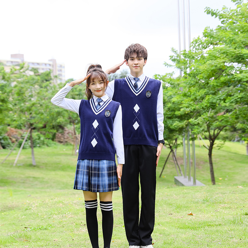 Este elegante conjunto malhas magistralmente combina estilo tradicional britânico com conforto contemporâneo. O colete com padrão de diamante cria uma aparência em camadas refinada que transita perfeitamente da sala de aula para eventos especiais, oferecendo estilo e praticidade para o ambiente acadêmico.
