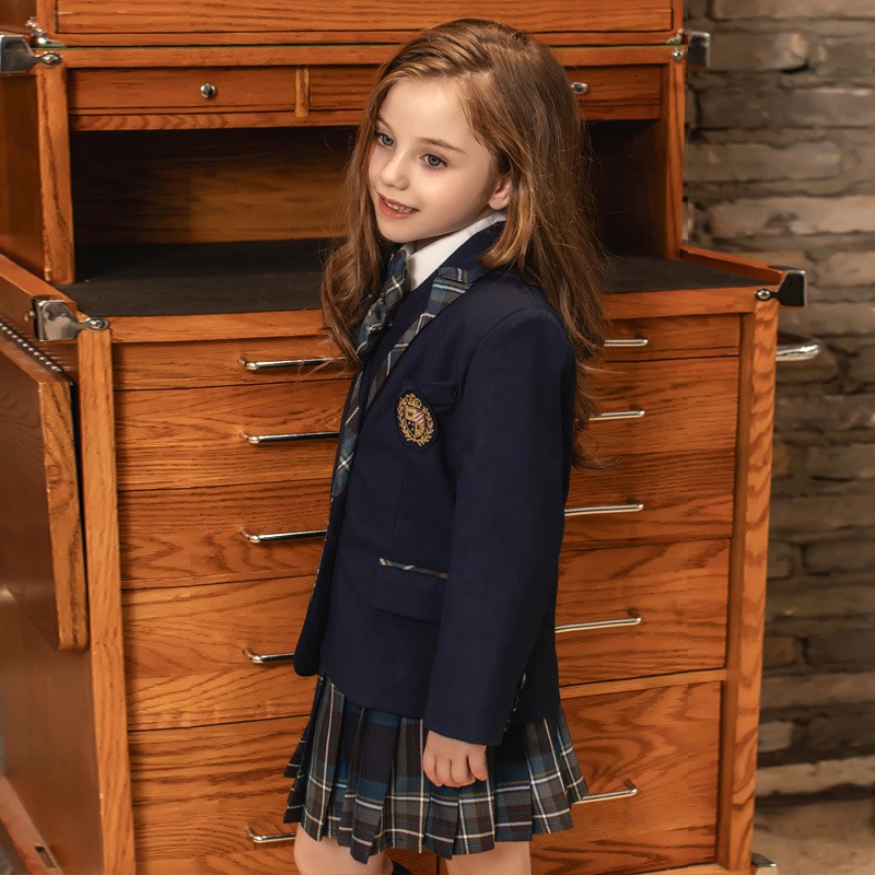 Silhueta Acadêmica Tradicional: O blazer sob medida e a saia plissada incorporam o estilo clássico da escola britânica, criando um visual formal instantaneamente reconhecível perfeito para cerimônias e fotografias.