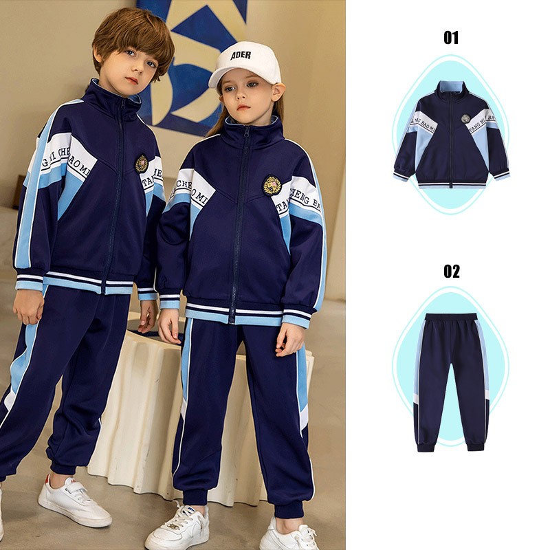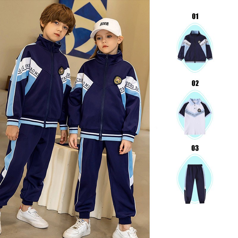 Esta coleção esportiva coordenada apresenta uma sofisticada paleta de cores azuis que cria harmonia visual em todas as peças. O conjunto oferece soluções práticas para diferentes estações do ano, mantendo uma estética atlética unificada perfeita para várias atividades escolares.