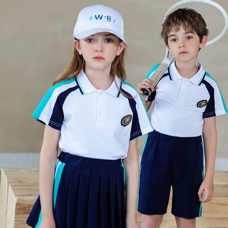 Estilo específico de gênero: Conjuntos de meninos e meninas compartilham o mesmo design de camisa polo, distinguidos por shorts personalizados (meninos) e saias plissadas (meninas) com listras laterais azuis combinando