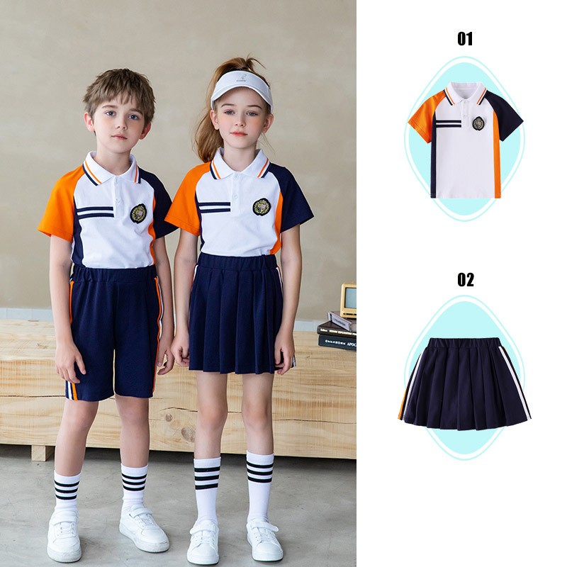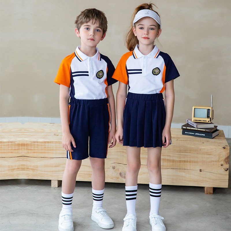 Design Adaptativo ao Gênero: Todos os alunos usam a mesma camisa polo com crachá escolar, enquanto os meninos apresentam shorts listrados laranja-branco e as meninas usam saias plissadas azul-marinho com detalhes laterais brancos