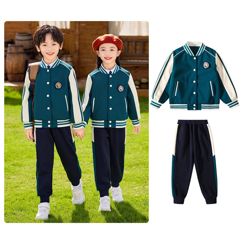 Coordinated Sportswear Elements: A jaqueta de beisebol e calças cônicas misturam requisitos uniformes tradicionais com estilo atlético contemporâneo que os alunos gostam de usar.