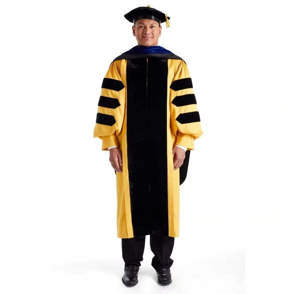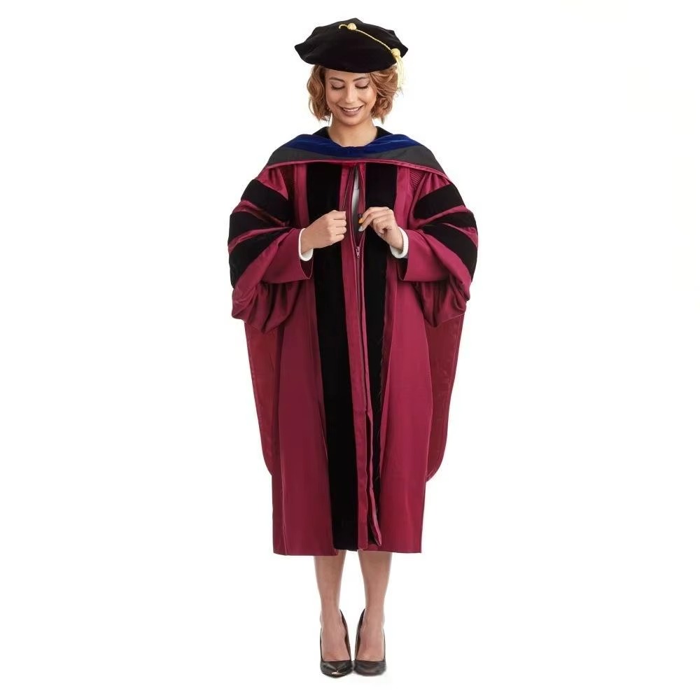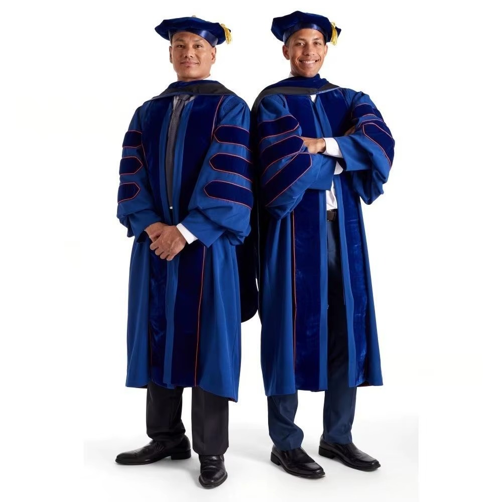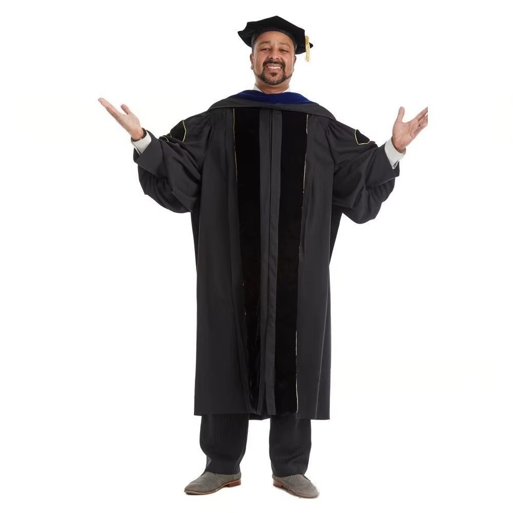 Como fabricante experiente de trajes acadêmicos, nos especializamos na criação de regalias de doutorado autênticas que atendem aos padrões acadêmicos internacionais. Nossos conjuntos de graduação de doutorado apresentam o design distinto de veludo de três barras, simbolizando o mais alto nível de desempenho acadêmico. Cada conjunto é meticulosamente elaborado para honrar as tradições acadêmicas, proporcionando a durabilidade necessária para o uso cerimonial repetido.