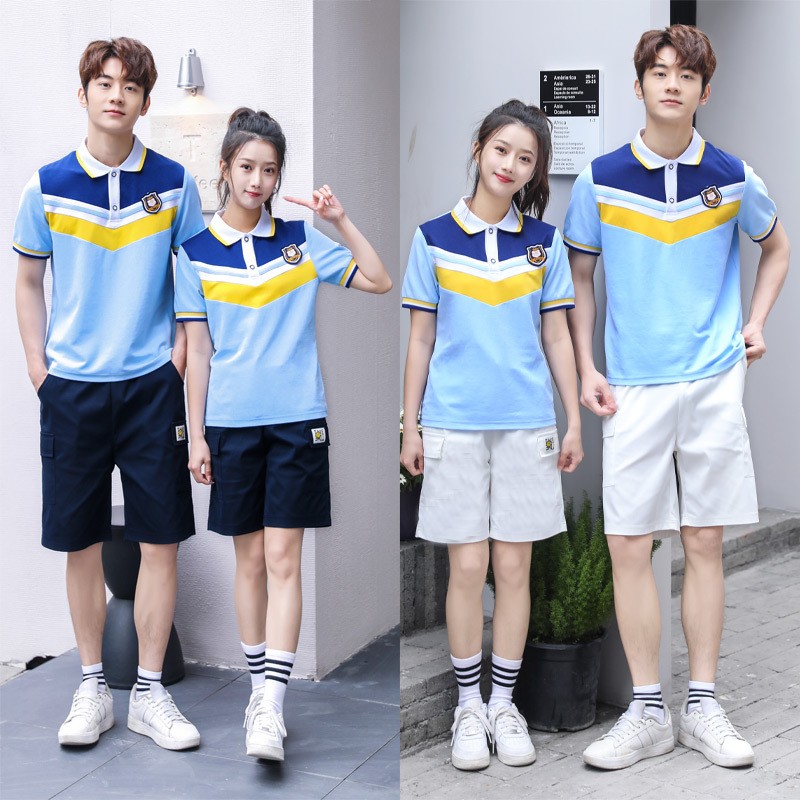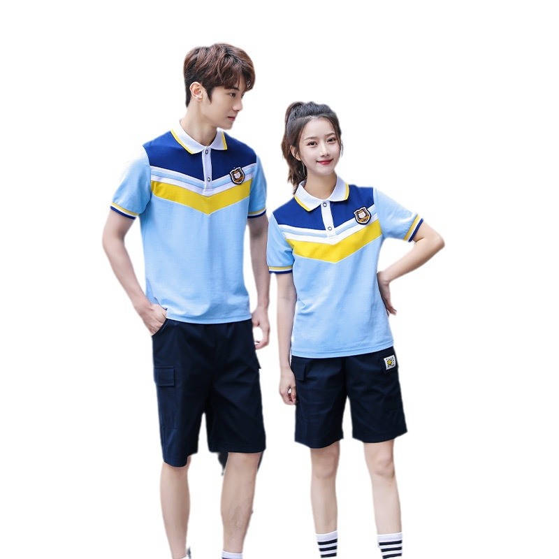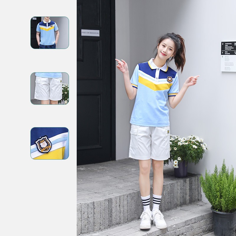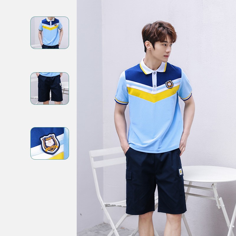 Este conjunto dinâmico de duas peças é projetado para manter os alunos frescos, confortáveis e com aparência nítida durante os meses acadêmicos quentes. O forte bloqueio de cores azul e amarelo em forma de V na camisa polo cria uma identidade moderna e energética, enquanto a escolha de duas cores curtas oferece flexibilidade para combinar com o estilo de qualquer escola.