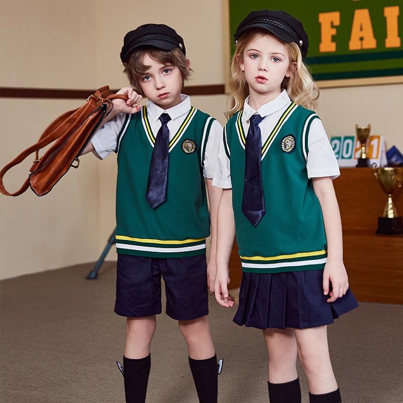 Esta elegante coleção verde esmeralda combina a estética tradicional de malhas com o conforto contemporâneo, criando uma imagem acadêmica sofisticada perfeita para eventos escolares de clima quente. Os acessórios coordenados e a rica paleta de cores estabelecem uma identidade distinta do campus.