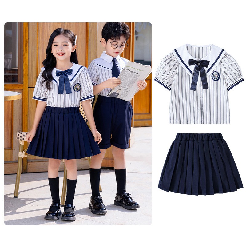 Este sofisticado conjunto de verão combina listras náuticas atemporais com elementos acadêmicos formais para criar um visual coeso para atividades escolares de clima quente. O projeto coordenado mantém a harmonia visual ao fornecer o desgaste confortável, respirável para a vida diária do campus.
