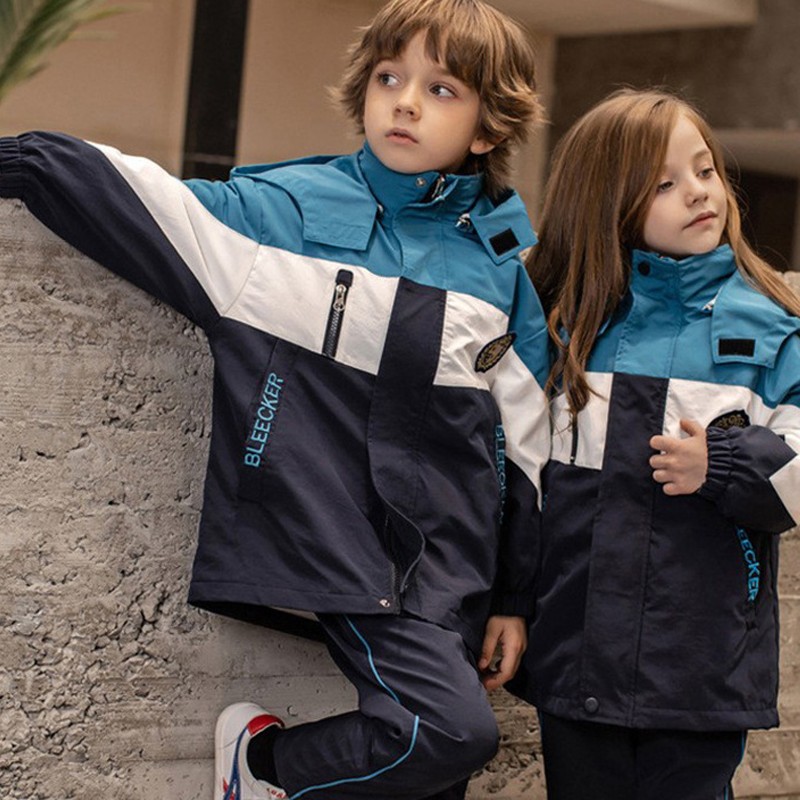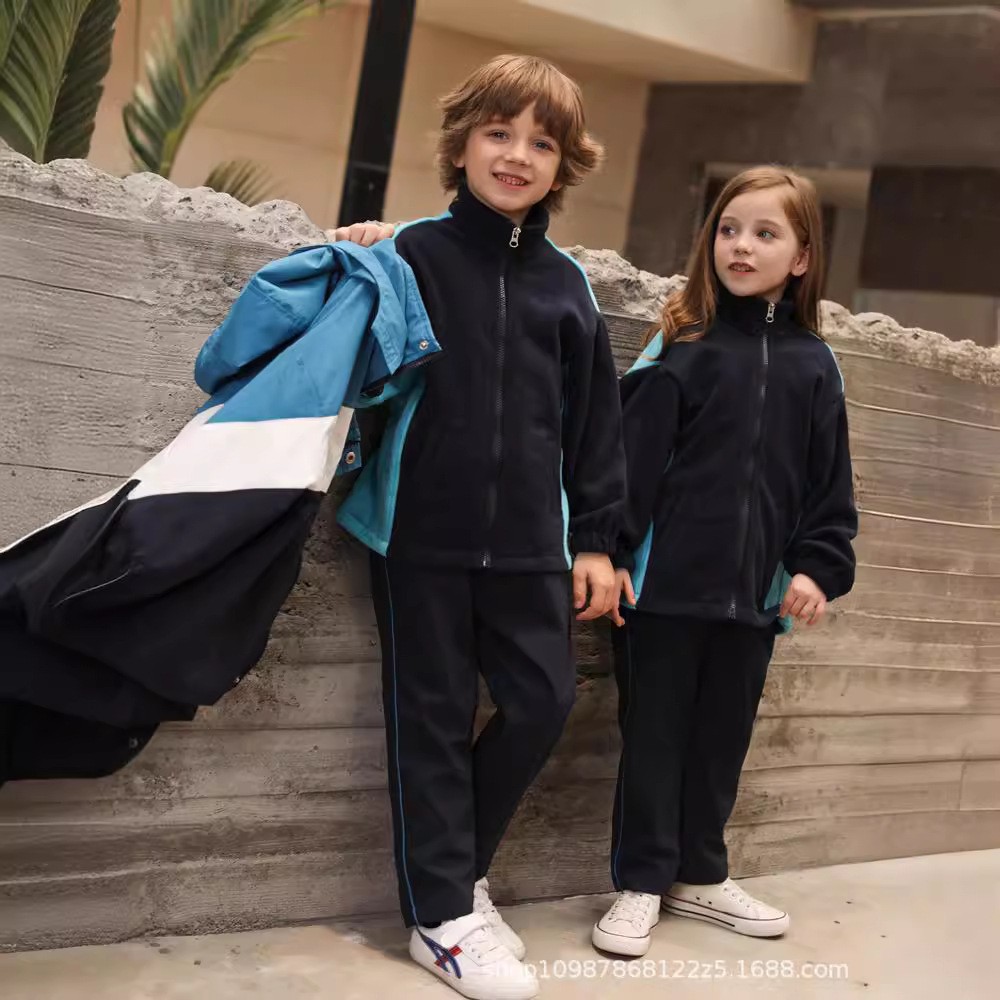 Um design dinâmico e funcional em três cores define este conjunto uniforme exterior 3 em 1. A jaqueta impermeável combina painéis azul claro, branco e preto, emparelhado com um forro de lã combinando e calças para um visual atlético coeso. Ideal para atividades de clima frio, este conjunto oferece versatilidade, calor e estilo, apoiando a personalização completa com insígnias escolares.